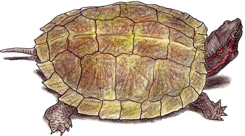 | Description | Carapace oval. Sides of carapace convex when viewed from the top. Carapace blackish brown with five vertebral scutes, posterior margin serrated. Head and neck dark brown with orange lines. Hatchlings have a relatively flat carapace that are greyish brown covered in dense black spots. |