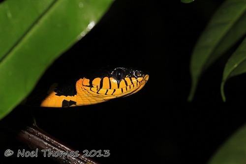 | Description | Head distinct from body. Body shiny black with a seies of 40 to 50 narrow bright yellow bands. The local subspecies, B. dendrophila melanota, has bands which do not meet over the back. Scales on the throat and along the lips bright yellow with black edges. |