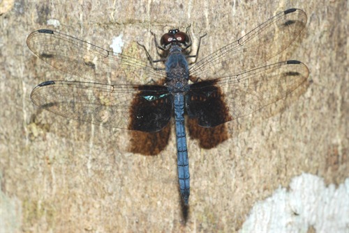 | Description | Males have blue body and broad metallic bluish-black area at the base of the hindwings. Females are slightly larger and slightly darkened wing tips and a light brown body with distinctive dark banding on its abdomen. |