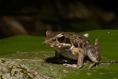 | Description | Previously confused with Rana baramica. Dorsal surface brown with dark blotches, ventral surface pale coloured. Ear drum black. Upper lip white. Skin on back and sides warty, long and slender hind limbs, with tips of digits not flattened. Its call is a high-pitched "yip-yip-yip" and can be heard in the evening. Tadpoles are elongated and reddish. |