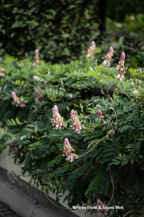 Flowers | Papilionoid (pea-like), with 5 furry-pubescent pink-white petals -- 1 light pink and white upper-petal ("standard") with pink-yellow nectar guide, 2 dark to purplish-pink lateral-petals ("wings") that form a cap over 2 white lower-petals ("keel"), which in turn enclose the reproductive parts within a boat-like structure. Inflorescences raceme, long and many floreted, upper portion pink, typically produced near top of plant. Florets open gradually from base to tip of inforescence over some 2 months. Each floret opens and becomes receptive from 4am, but lasts only for 24 hours. Flowering occurs from mid-May to end October during rainy season in native range, but plant blooms almost year-round outside of natural habitat, as observed in urban Bangkok and Singapore. Florets pollinated by bees, chiefly Megachile velutina (Leafcutter Bee), which visit the plant for nectar, pollen and leaves (used as nesting material). Species is thought to be cross-pollinating and self-incompatible. |