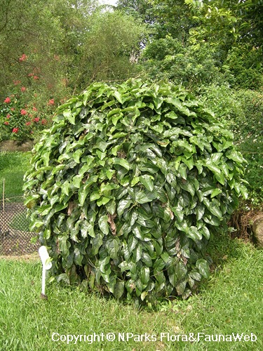| Foliage | Leaves are heart-shaped with entire leaf margin (9 - 28 cm long, 4.5 - 16.5 cm wide). Venation is slightly sunken. |