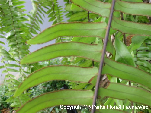 Nephrolepis acutifolia or Paku Uban Bukit is a native fern that grows terrestrially or as an epiphyte. Fronds are long, drooping of up to 1.5 m or more. The leaflets (pinnae) are linear to lance-shaped with a short broad tip and smooth margins. The base of the leaflet are boxy, heart-shaped to rounded, ear-like lobes may be present. Unlike most Nephrolepis species which produce kidney-shaped sori on the underside of the leaflet, this species produce linear sori along the margins.