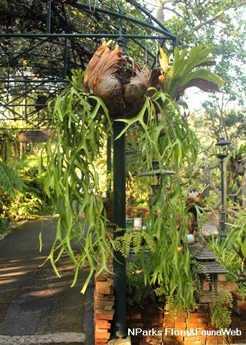 | Associated Flora | Closely associated with Ophioglossum pendulum (Adder's Tongue Fern), whose spores develop in the nest-fronds of Staghorn, and draws nutrients from the host-fern via a fungus intermediary, until it emerges with long ribbon-like fronds that descend from the host-fern. |