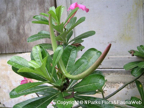 | Cultivation | Although this species is commonly known as 'Desert Rose', it grows well in tropical, humid climates. Insects are generally not a problem, but be careful of scale insects, mealy bugs and spider mites. Fungal and bacterial stem or root rot cause serious damage that is difficult to treat. Infected plant parts should be removed immediately. To obtain a plant with a swollen base (caudex), the plant needs to be propagated from seed and not by stem cutting. |