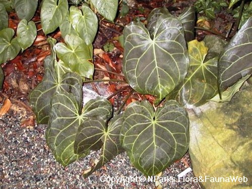 | Foliage | Leaves broadly elliptical or ovate, dark green sometimes red-tinged, measures up to 40 cm long and 22 cm wide, broadest at middle, has white main veins, apex acuminate, base deep lobed. |