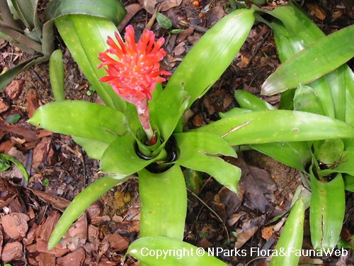 | Cultivation | The plants can be grown as epiphytes on trees. Plants should be planted in well-drained soils. Fill the center cup with water and do not let it dry out. Plants can be propagated by dividing off the young pups. |