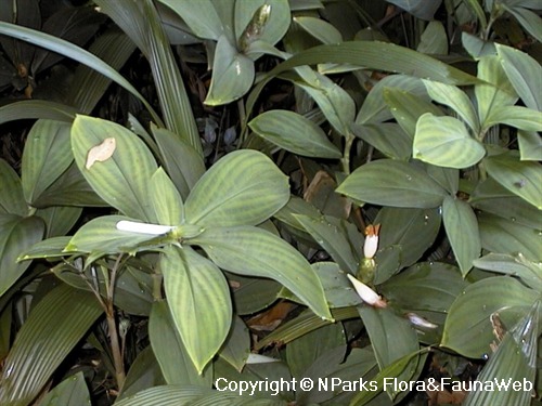 | Similar | Costus elegans (= C. malortieanus) vegetatively resembles C. osae but can be differentiated by the faint dark-green banding on the leaves, green globular inflorescence, showy flowers marked with yellow and brown stripes, and a minuscule ligule (projection at the top of the leaf sheath). |