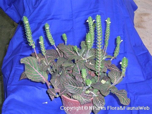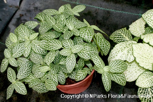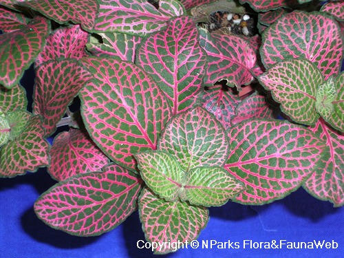 | Others - Plant Morphology | Herbaceous shrub, up to 15cm height, creeping and rooting at lower nodes. Stems covered with fine white hairs. Leaves 5 - 10cm long, dark green with dense network of reticulated rose-red veins. Flowers white to red-tinged, tubular, 2-lipped, insignificant, produced in axils of congested spike inflorescence with overlapping green bracts.Suitable as potted or terrarium plant, or part of dish garden. Can also be used as colourful groundcover to brighten up shady landscape areas receiving indirect dappled sunlight. Requires high humidity. Likes well-drained, loamy soils rich in organic matter. Water regularly to prevent withering, but avoid overwatering which may cause yellowing of leaves. Waterlogged soils may promote leaf and stem rot. Pinch off stem-tips to promote bushier growth. If grown for striking foliage, flower inflorescences may be removed. Propagate by stem cuttings, layering or division.Genus epithet 'Fittonia' named in honour of Elizabeth and Sarah Mary Fitton, 19th century authors of 'Conservations on Botany'. Species epithet 'albivenis' means 'white veined', a reference to the white-veined leaves of the species form. The group name is named after Belgian nurseryman, botanical author and artist, Ambriose C.A. Verschaffelt (1825-1886). |