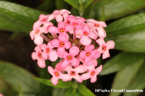 | Flowers | Salverform flowers are tubular with 4 bright pink lobes arranged in the shape of a cross (2 cm long, 1 cm wide). They are arranged in rounded clusters known as cymose inflorescences (5 cm wide). Flowers are most fragrant after sunset. |