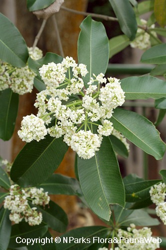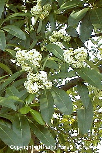 | Flowers | Inflorescence is branched (cymose), measuring 4 – 13 (– 17) cm long, and occurs at the terminal ends. The flowers are white, yellow or cream and are fragrant. The flower lobe is broadly ovate or suborbicular (3 – 5 mm long and 2.5 – 4.5 mm wide) and overlaps to the left. The flowers are strongly scented and have the potential to cause sensitivities in certain individuals during intense flowering periods. |