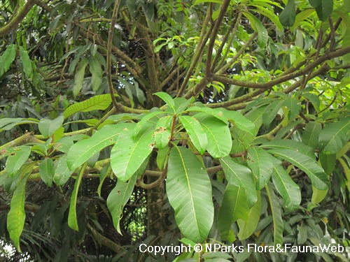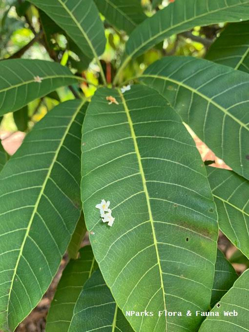 Dyera costulata or Jelutong is a native tree of Singapore that grows up to 80 m tall. It has whorled leaves, flowers are 5 petalled, white, yellowish-green or pinkish-yellow in colour. The fruit is a paired, woody follicle up to 40 cm long, splits upon maturity releasing flattened elliptic seeds with a membranous wing.