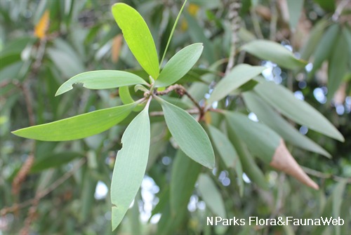 | Foliage | Its alternate, stalked leaves have leathery leaf blades that are elliptic to lance-shaped, greyish-green, and 3-12.5 by 1.1-3.75 cm, with distinct longitudinal veins. |