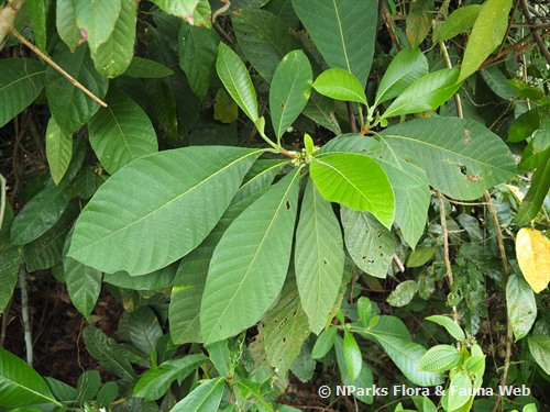 Foliage | Its opposite, stalked leaves have almost leathery leaf blades that are broadly drop-shaped, with a short tip, 7.6–35 by 2.5–20 cm, and gradually tapered to the base. |