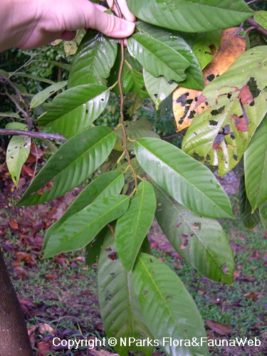 | Foliage | Its stalked, alternately-arranged leaves have leaf blades that are elliptic-oblong, and are about 12 by 5 cm. |