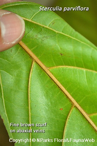 | Etymology | Genus epithet 'Sterculia' named after Sterquilinus (or Sterculius), the early mythological Roman god of manuring and fertilization (where 'stercus' means 'dung' in Latin) -- alluding to how some species from this genus produce a foetid scent. Species epithet 'parviflora' means 'small-flowered' in Latin, a reference to the plant's blooms. |