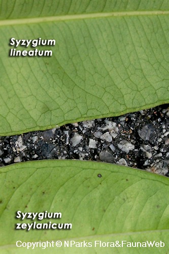 | Similar | May be confused with the taller Syzygium lineatum, but the latter species can be differentiated by its bigger, matte dark green mature leaves with more closely-spaced secondary veins and distinct marginal vein, light green young leaves, larger fruits (10 - 13mm across), and pinkish-grey trunk. |