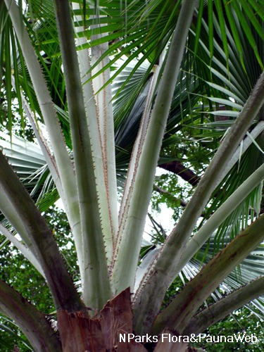 | Foliage | Fronds fan-shaped, bluish-green/silverish-green, waxy, 18 to 30 segments, visibly wedge-shaped, up to 2 m long and 60 cm wide. |