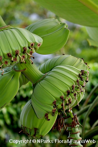 | Others - Plant Morphology | Herbaceous shrub, up to 5m height when planted in ground, smaller if grown in pots. Fronds glossy green, broad and large, 1m or more in length. Rigid pseudostem (trunk) initially arising as sucker from underground rhizomes, made up of overlapping fleshy frond-sheaths. Pseudostems and underside of leaves have whitish powdery coating.Flowers yellow, inconspicuous, held in long racemes (fruiting stem), enclosed by scarlet-red leathery bracts. Plant is monoecious, with separate male and female flowers in inflorescence on the same plant. Flower pollinated by ants, bees and birds. Female flowers can also set sterile fruits without pollination by means of parthenocarpy.Fruits ("fingers") are pulpy berries with leathery outer peel, formed in layers called combs or "hands" consisting of 10 - 20 bananas each, with several "hands" per fruiting stalk. Each "hand" consists of many "fingers" packed closely into a fused mass, which resembles a baseball mitt or a cupped hand. Two adjacent "hands" lying next to each other form what appears to be a clasped pair of hands. Fruits ripen (without splitting) from green to yellow in 2 - 3 months, with edible vanilla-flavoured pulp.Dwarf cultivar from Saba sub-group of typically massive banana species. Plant is ABB triploid, formed from hybridization of pulpy-fruited Musa acuminata (diploid AA) and Musa balbisiana (tetraploid BBBB), producing short, plump and sweet "Lady Finger" type fruits, suitable as dessert bananas -- as opposed to Cavendish type of bananas found at supermarkets.Popular collectors' item amongst banana ethusiasts. Ideal for economic gardens, or as focal plant for its unqiue-looking fruits, and to impart tropical feel to the landscape. Vigorous and fast-growing. Prefers moist soils and lots of watering, but does not tolerate being soaked in standing water. Fairly wind-resistant, but avoid locating plant in very windy areas to prevent leaves from being shredded into thin strips. Heavy feeder -- fertilize once monthly if soil is fertile, or once weekly if soil is poor. Prune off dying old fronds from pseudostem for a neater look. Prop up fruiting stem if this is leaning excessively due to the weight of the inflorescence and maturing fruits. Post-fruiting pseudostems may start to decline, so these can be removed to make space for emerging suckers, Propagate by division of suckers and seeds (rarely produced and may not be viable).Genus epithet 'Musa' named after Antonius Musa (63 - 14 BC), physician to first Roman emperor, Octavius Angustus. Also the Arabic name for the fruit, perhaps after Prophet Musa (Moses). Musa x paradisiaca form named by Linnaeus in relation to the Qu'ran's reference to banana as the "Tree of Paradise". |