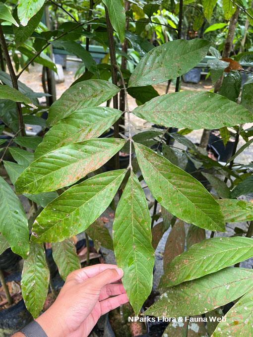 | Foliage | Leaves are paripinnate, up to 3 pairs of leaflets each. They are leathery to papery, egg-shaped to elliptic, sometimes pear-shaped, 4.2 - 31 cm long by 1.4 - 12 cm wide. Veins and veinlets are raised on the underside. At the base of a leaflet, the stalk is swollen and a sac-like cavity (domatia) can be found at the axil. |