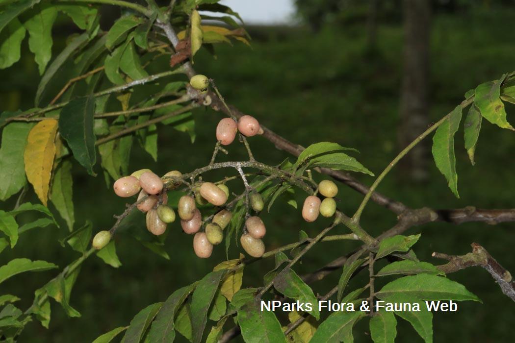 Clausena excavata, also known as Chemama or Pink Lime-Berry, is a native tree that can grow up to 15 m tall. The leaves are fragrant and contain tiny oil glands that release a strong scent when crushed, similar to the Curry Leaf Tree, Bergera koenigii. Butterfly caterpillars feed on its leaves, while birds relish its pink, berry-like fruits.