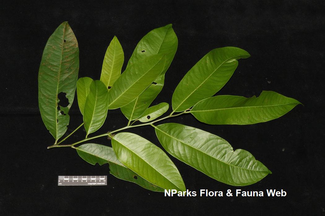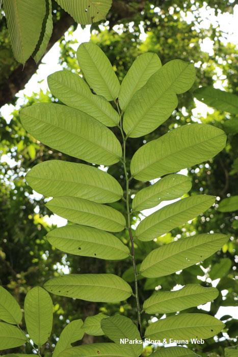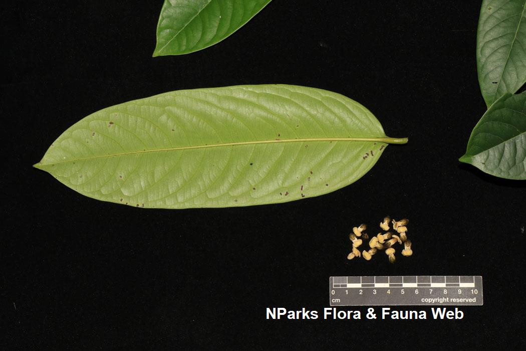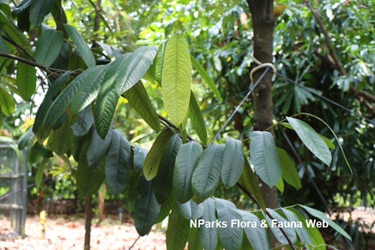 Foliage | The leaves are ovate or oblong, measuring 14 – 40 cm long and 4.5 – 13 cm wide, and in alternate arrangement. Each leaf has 15 – 22 pairs of lateral veins. The leaf tip is pointed while the base is rounded to acute. The petiole is 1 – 1.5 cm long. The leaf size can be highly variable. |