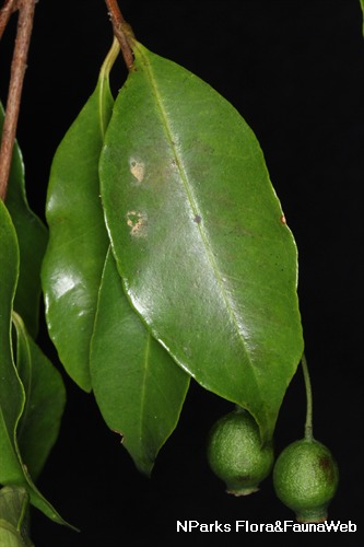 | Foliage | Its opposite, stalked leaves have leaf blades that are leathery, dark green, lance-shaped to egg-shaped or oval, 5–11 cm by 1.8–5 cm. Each leaf blade has 1–2 veins running parallel to the blade margin, up to 7–16 pairs of side veins, and pointed blade tip. |