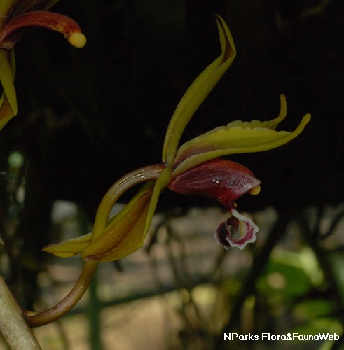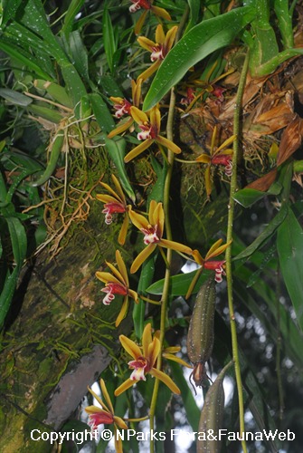 | Flowers | The flowers are borne on a pendulous inflorescence up to 50 - 100cm long and are well spaced out. The flowers grow about 5cm in diameter. The sepals and petals are yellow with or without red streaks running along the middle. The flower lip is three-lobed, the lateral lobes is triangular and acute in shape. The middle lobe is recurved and white with red markings. The flower columnn is dark red and curved. |