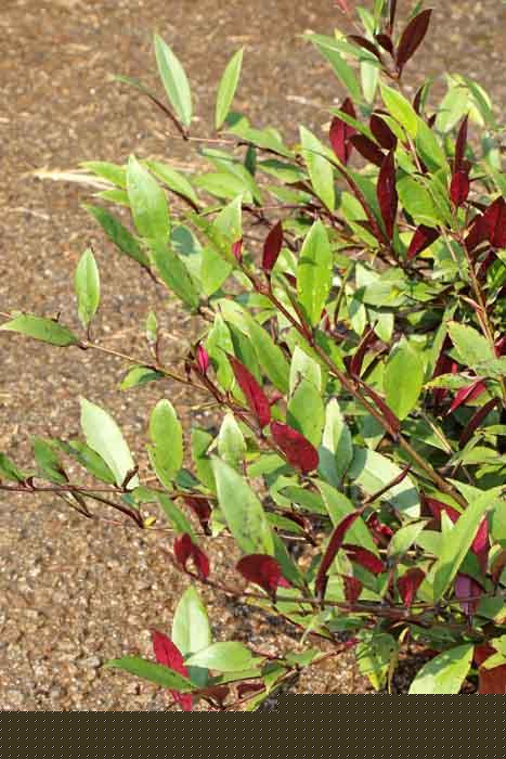 | Foliage | Its opposite, shortly stalked leaves are fleshy, lance shaped or lens shape with a pointed tip, dull green on the topside and purple on the underside, 7.6 - 10.2 cm long by 2.5 - 3.8 cm wide. |