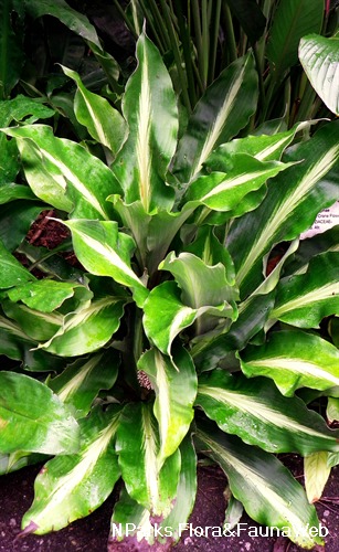 | Foliage | Leaves to 40cm in length, upper surface dark green with pale greenish yellow markings along the midrib, hairy, margins undulate. |