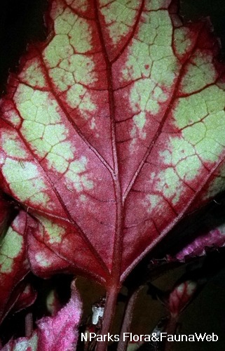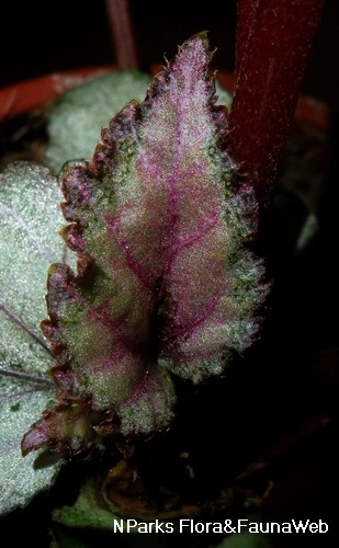 Foliage | Mature leaves to 10 (-12) cm long, base color dull silvery green, centre of leaf flushed iridescent purplish pink, with a dull pink border along the leaf margins, leaf margins with sparse, short hairs. Under surface of leaves pale dull green flushed with red; veins red. Petioles red, pubescent. Juvenile leaves pale silvery green flushed with pale purplish pink. |