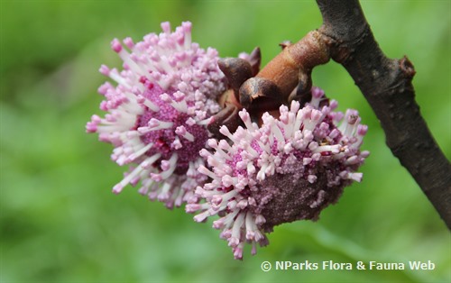 | Flowers | Its flowers are pink or yellow and tiny, with male flowers 1.5-2 mm long, and female flowers up to 10 mm long, The flowers are borne on branched head-like clusters, with the male clusters 2 - 5 cm wide, and female clusters 6 - 9 cm wide. |