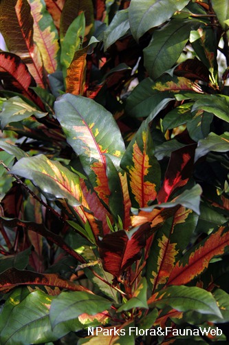 Foliage | Foliage: Leaves elliptic, to 20 cm long by 6cm wide. Color of leaves variable; leaves entirely light to mid green, or with pale yellow markings flushed with red or puurplish red, towards basal 1/3 of the leaf or covering up to half of, or almost the entire leaf. |