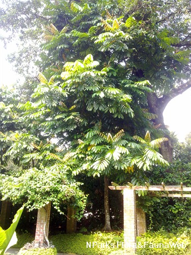 | Foliage | Its alternate, stalked, pinnate leaves have 3–5 pairs of leaflets. Its stalked leaflets have leathery leaf blades that are red when young, 8–16 by 18–35 cm, and with toothed margins. |