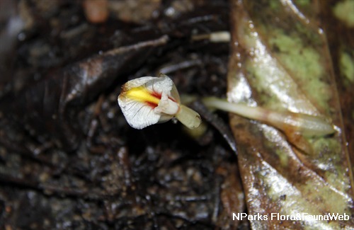 Flowers | Inflorescence borne on a separate, leafless shoot; partially or completely hidden by the substrate or leaf litter. Flowers to 3cm in length, corolla lobes very pale greenish -white, crystalline. Lip white with bright yellow median stripe, tinged with red towards the base of the lip. |