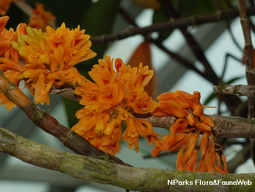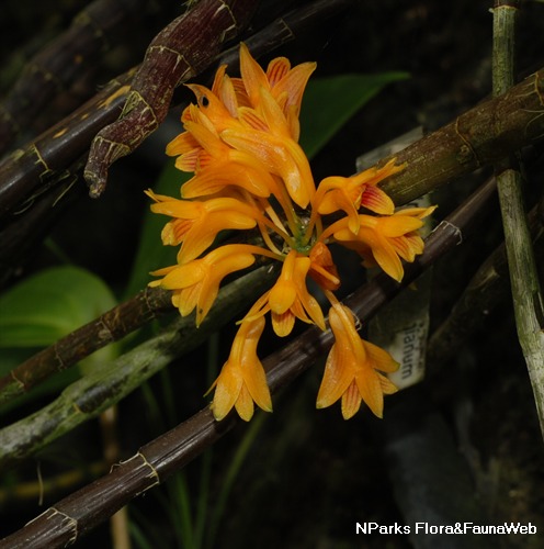 Flowers | The flowers are borne on short inflorescences on old, leafless stems. The flower sepals, petals and lip range in colour from yellow to orange and have red stripes running along their length. |