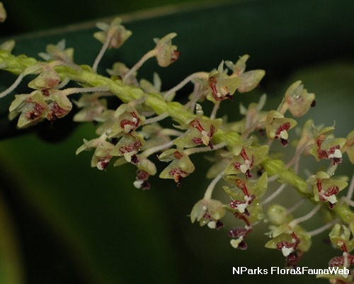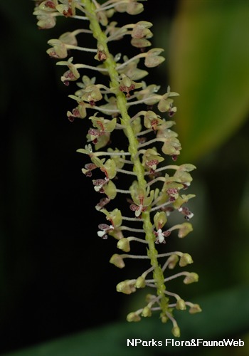 Flowers | The flowers are borne in many (40 to 50) flowered racemes which originate from the stem apex. The small flowers have light green sepals and petals. The flower lip has a white calli and is 3-lobed with red splotches. |
