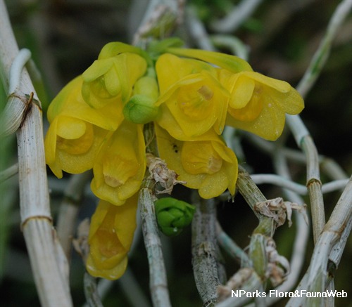 | Flowers | The flowers measure about are borne on the leafless pseudo-bulbs on short, axillary racemes. The sepals and petals are yellow. The flower lip is yellow and folds up at the apex near the anther and the side of the column, giving the flower a 'closed' look. |
