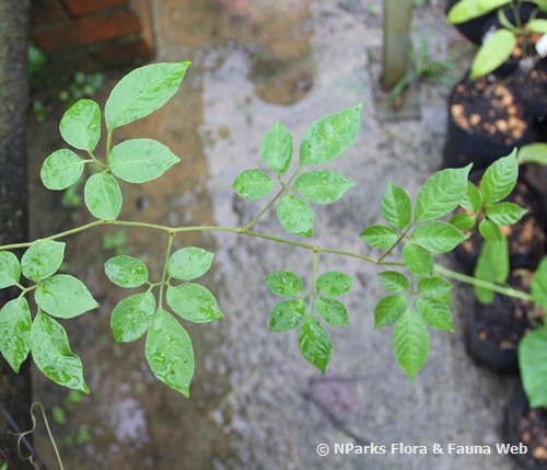 | Foliage | Compound leaves, arranged alternately along the stems. Each leaf has 5 leaflets (5-foliolate) where the leaflet is ovate in shape and has serrated/ toothed margin. Young foliage is reddish in colour while the mature foliage is green. Tendril is red. |