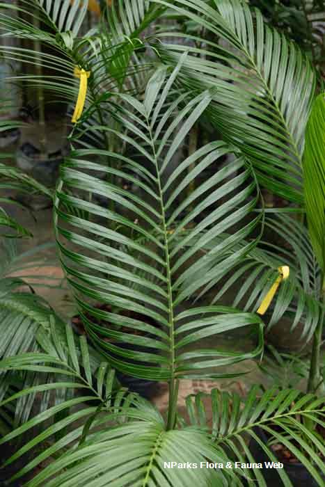 | Flowers | The erect inflorescence is an infrafoliar panicle, emerging below the fronds and the crown shaft and subtended by a spathe or penduncular bract. It branches to two orders with more than 15 spirally arranged, yellowish-green first-order branches. Male flowers are mostly inserted in pairs with 6 stamens. |