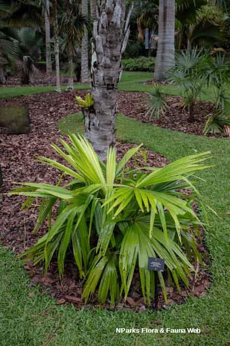 | Foliage | The fronds are costapalmate (a type of palmately compound leaf in palms in which the petiole extends into the leaf blade, known as the costa). The petiole (leaf stalk) can reach 1–3 m long with two bright yellow longitudinal lines and stout marginal spines. The spines in younger plants are much bigger than those in older, mature plants. The leaf blade is deeply divided into 3–4 fold segments, which are further divided by shallower splits into single-fold segments. These single-fold segments are V-shaped in cross-section. |