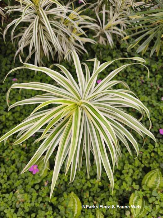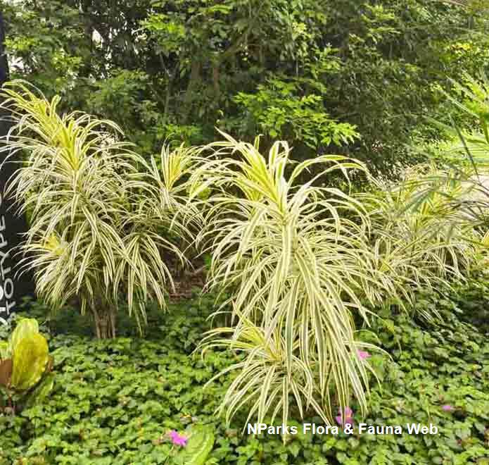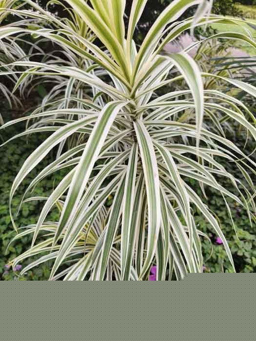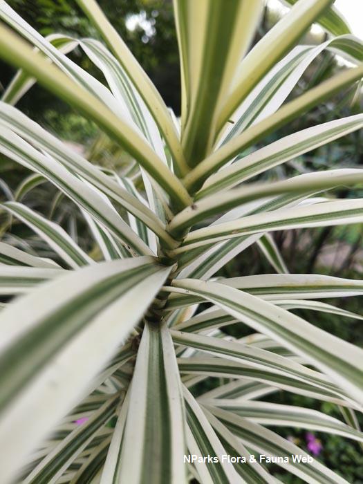 The Dracaena cultivar is an erect shrub with narrow, sword-like leaves arranged in distintive rosettes along its slender stem. The lanceolate leaves have white edges contrasting with dark green central stripes. This cultivar grows well in full sun and moderate watering, and require minimal maintenance requirement.
