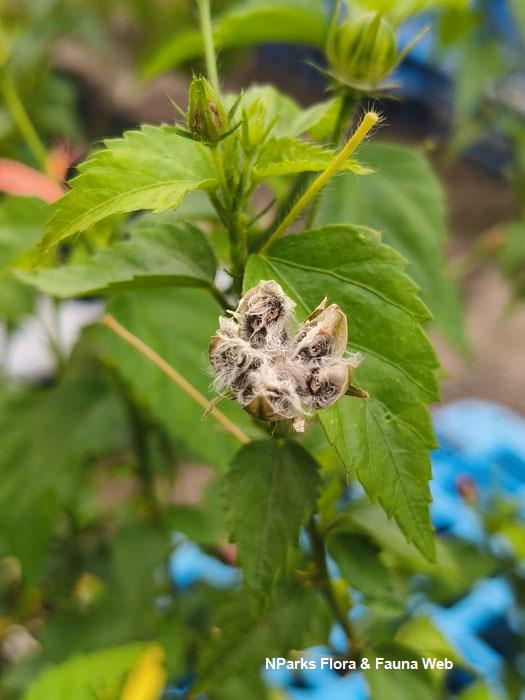 | Fruit | Capsule, ovoid to globose-shaped, measuring 7-10 mm in diameter. The outer surface is slightly hairy while the inner surface smooth. It has 5 locules, with each locule having 2-4 seeds. Seeds are kidney-shaped (reniform), measuring 3-3.5 mm long, greenish black and densely covered with long silky hair. |