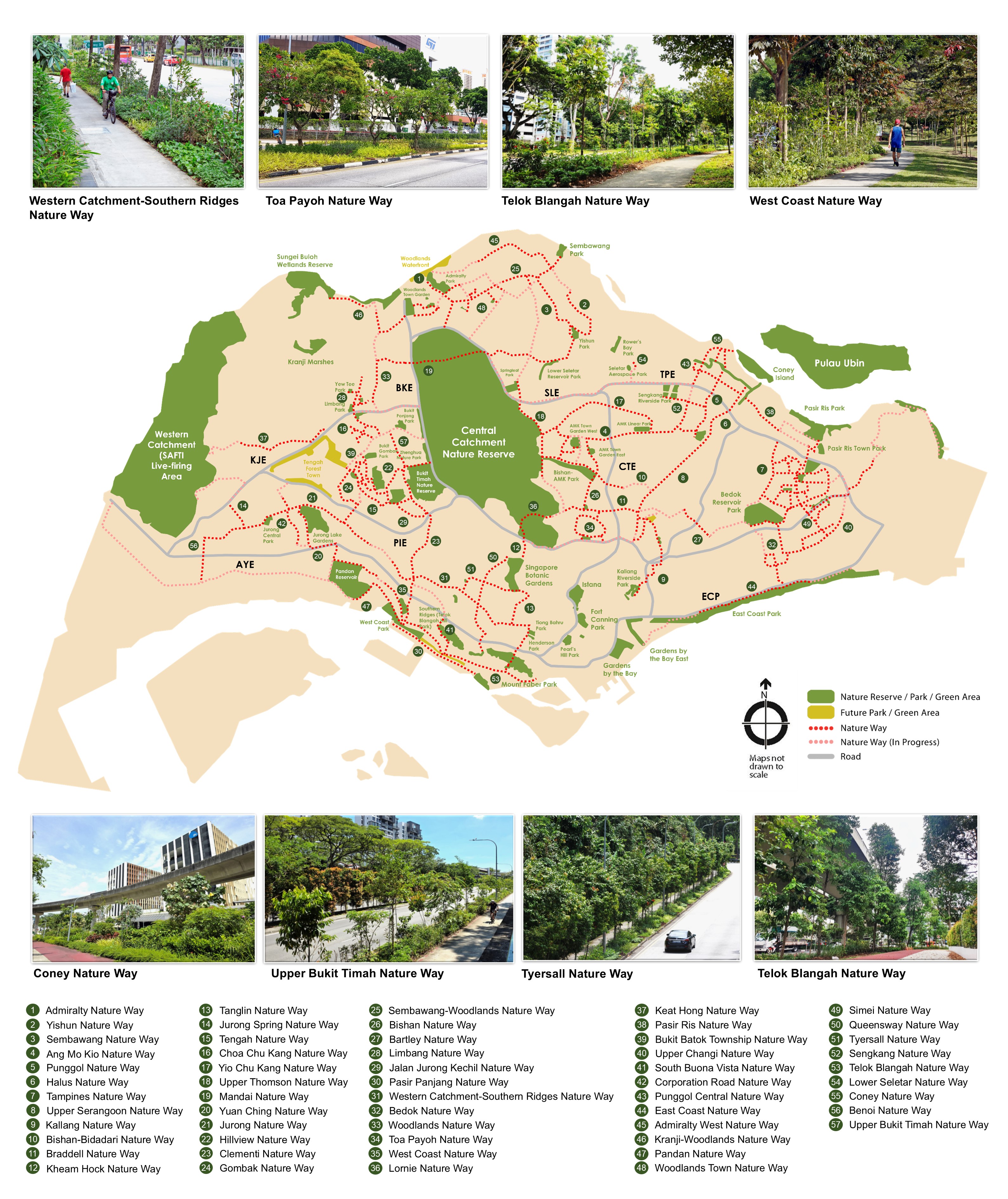 Currently, there are 57 nature ways in Singapore, stretching 260km in total. As part of the Singapore Green Plan 2030 to transform Singapore into a City in Nature, we aim to have 300km of Nature Ways by 2030.